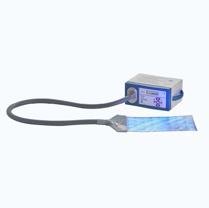 Lightweight design with optical cable lock and failure alarms for sensor/cooling fan ensures clinical reliability. Roll stand option provides mobility while maintaining therapy continuity. The fiber optic bundle maintains light transmission integrity while soft pad conforms to infant body contours for maximum skin exposure during extended treatments.