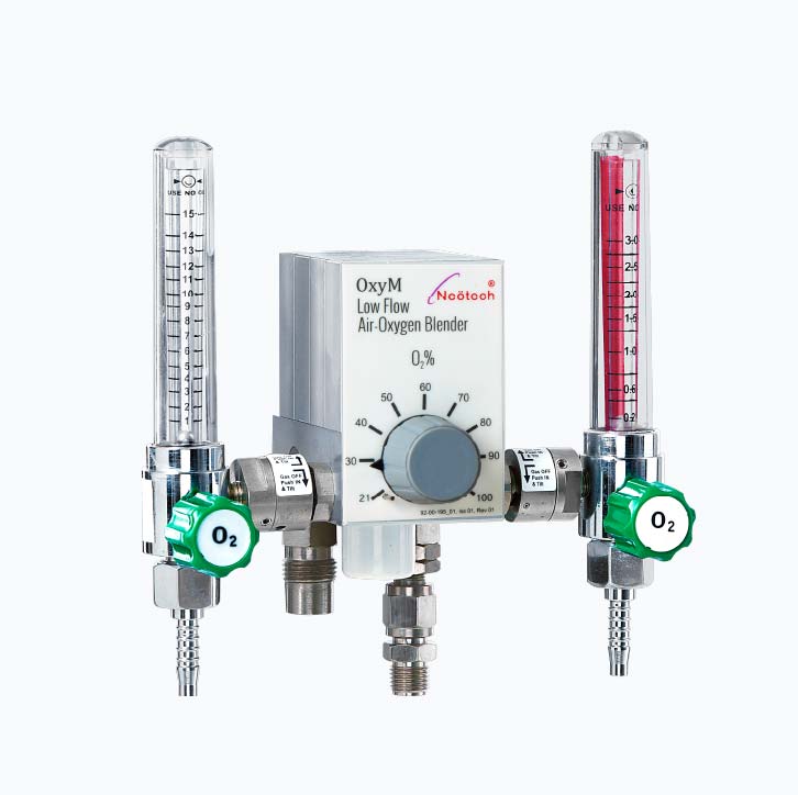 nice 5005 is an advanced low-flow Air Oxygen Blender designed for neonatal intensive care units, providing accurate blending of medical air and oxygen to achieve precise FiO₂ concentrations from 21% to 100%. Engineered with a robust aluminium body and highly precise mechanical components, it ensures reliable performance for Bubble CPAP, ventilators, SiPAP, resuscitators, and other low-flow respiratory applications.